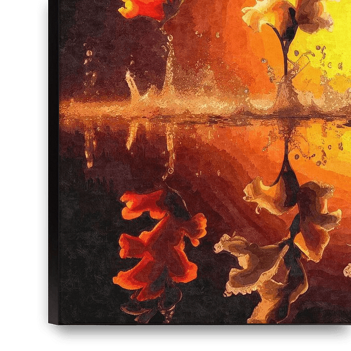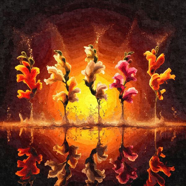 Six bright snapdragon flowers in red, orange, yellow, pink and peach colours rise from a reflective water surface. The textured background in warm shades of red and yellow is reminiscent of a sunset and enhances the intensity of the colours. Splashes and drops lend dynamism and movement, while the symmetry of the reflection creates calm…