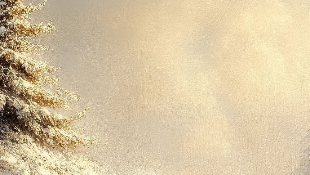 Snow Landscape - This is a Christmas tree painting of a lone snow-laden pine on the left of the canvas standing in soft golden light against a misty winter sky, a modern landscape painting with realistic, slightly impressionistic brushstrokes - Christmas tree painting, painting Christmas tree.