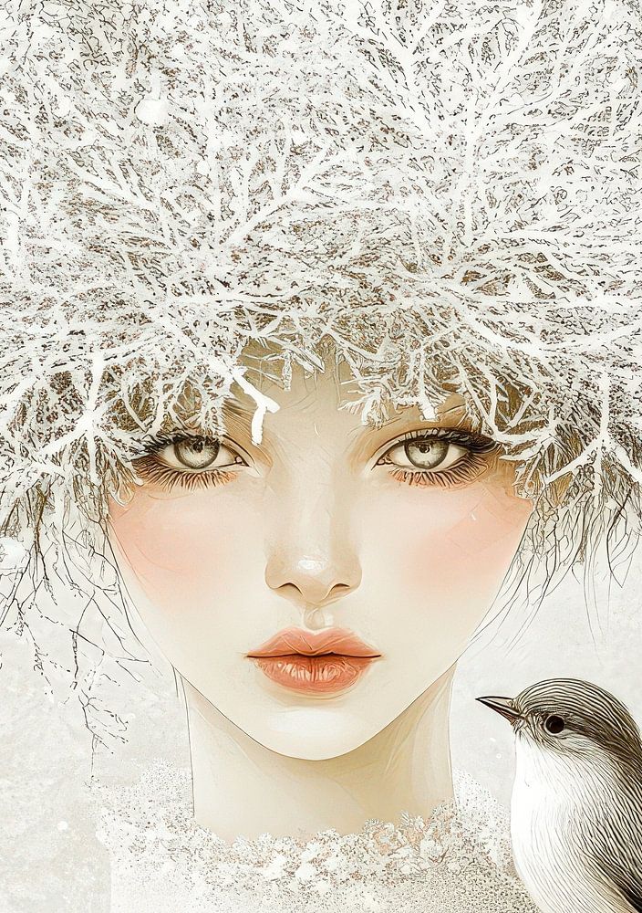 A fairytale portrait of a woman with a crown of snowflakes and a little bird on her shoulder. The soft colours and harmonious composition make this work a perfect choice for those who want to create a soothing winter atmosphere in their home.