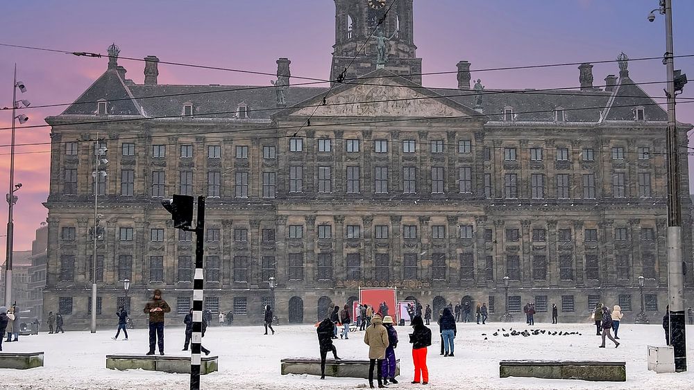 Snow-covered Amsterdam on Dam Square in the Netherlands in winter at sunset by Eye on You