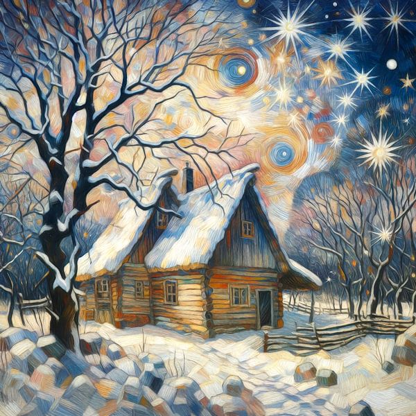 A wooden hut stands in a snowy landscape with bare trees under a swirling, star-studded sky. The scene combines elements of winter and night, creating a peaceful and dreamy atmosphere.