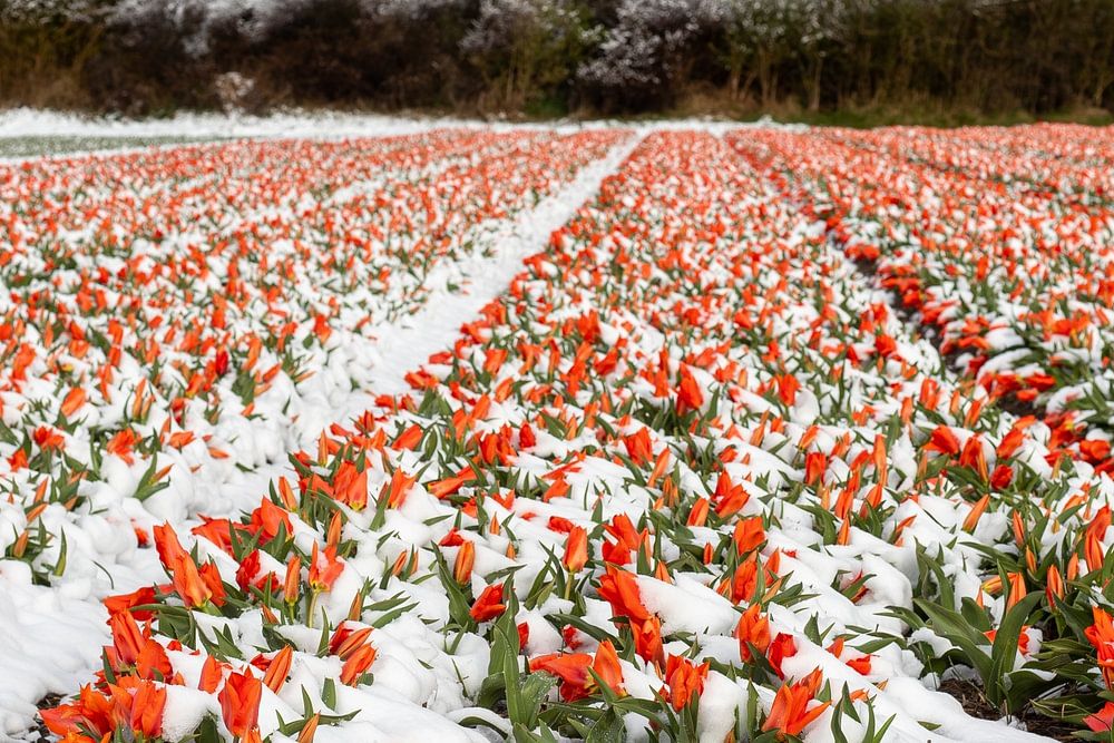 Snow field with tulips. Noordwijk, South Holland, Netherlands