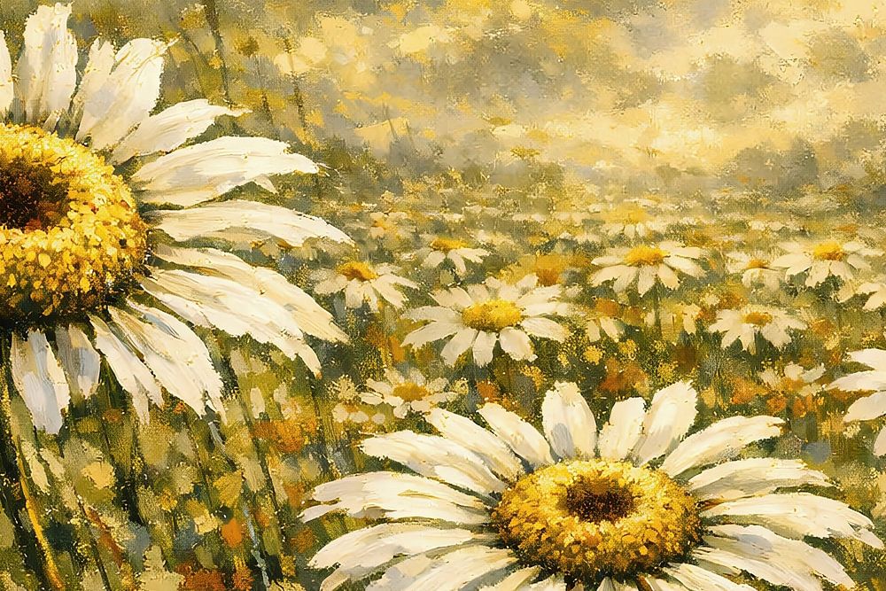 In this artwork, ‘Whirlwind White’, the innocence of the daisy meets the raw energy of a summer storm. The thick, expressive brushstrokes and the stark contrast between the deep grey sky and the radiant white petals create a composition that never fails to captivate. At the heart of the chaos, the colour white stands still. 'Wervelwit'…