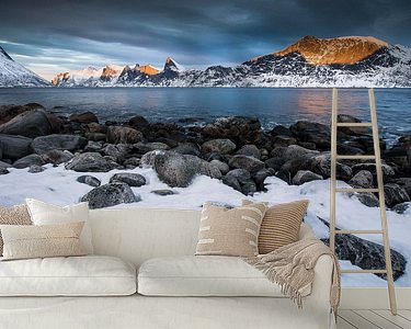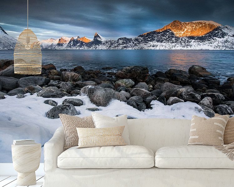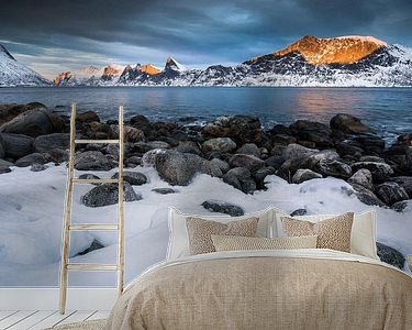 A typical snowy landscape on Senja peninsula in the far north of Norway. Senja lies between Tromso and the islands of the Lofoten and contains a number of beautiful fjords. In winter, the landscape turns into a snow-covered wonderland.