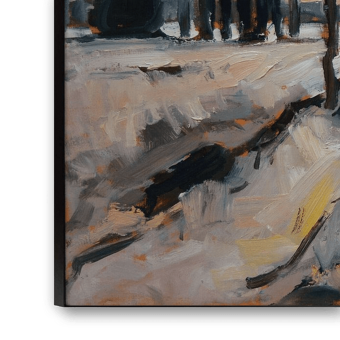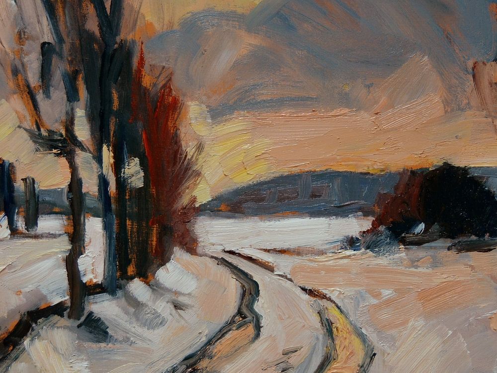 I look at the evening red. The warm light sets fire to the melted snow in the tractor tracks. It is quiet, here I can hear the robin chirping and in the distance in the sky a crow scratching. The stillness and the whole setting reminds me of a painting by Anton Mauve. I have to paint fast, the light changes every five minutes. With blobs and touching brushstrokes, I paint this landscape near Mechelen in southern Limburg with firm strokes quickly on my panel. It is winter.
