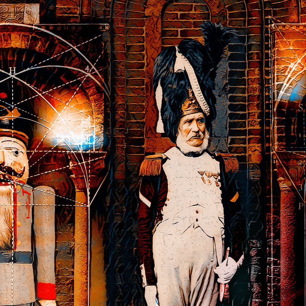 So one nutcracker is not enough to guard that Christmas tree. So there are three of them standing there. The Christmas tree is really less important here than the three nutcrackers, although of course they seem to be guarding the tree. Apparently the middle one feels like the leader of this little bunch consisting of his two wooden friends. The atmosphere here is good though, warm and cozy. The colors of this artistic work are burgundy, red, orange, gray, cream, and a touch of blue.