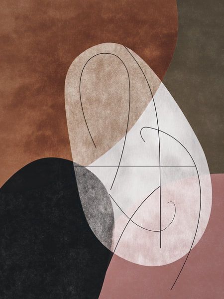 This mid-century modern abstract artwork plays with flowing lines and geometric shapes in black, brown, beige, grey and pink. One large flower petal forms the central element, giving the work an organic and calm character. The background consists of soft earth tones that provide warmth and balance. Together, colour and shape create a…