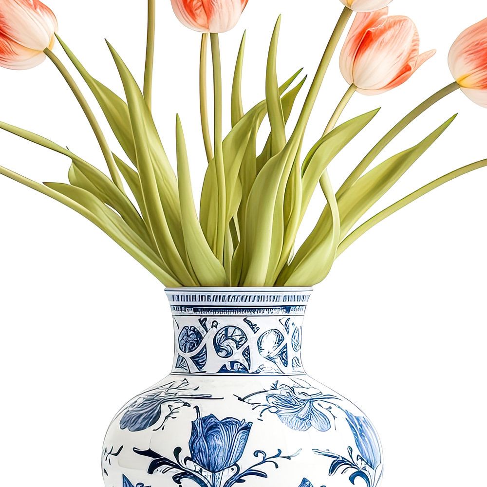 A classic still life with soft orange tulips in a Delft blue ceramic vase.
