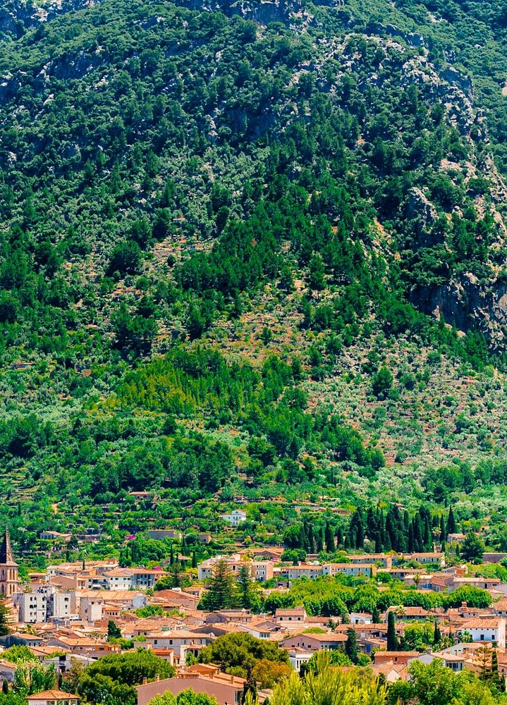 Panoramic landscape view of street to the mediterranean village of Soller on Mallorca