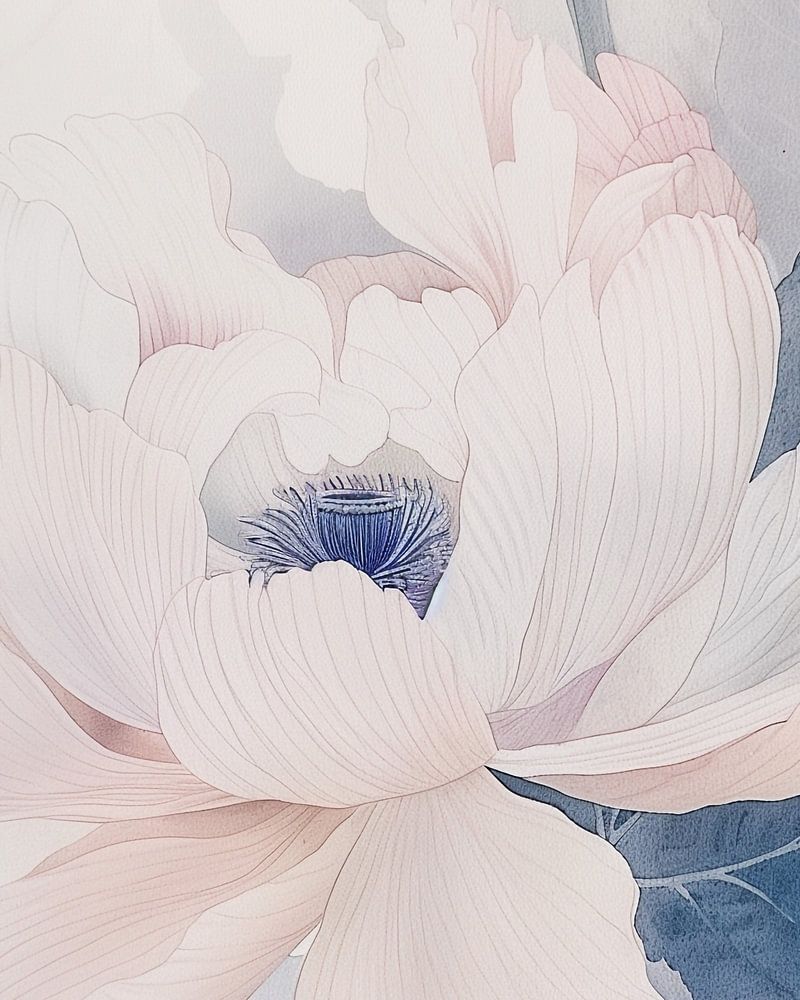 Delicate and sophisticated composition of flowers, exuding serenity and elegance. The colours are soft and subdued, with a combination of pale pink flowers and blue leaves that blend harmoniously against a white background. This subtle colour combination gives the artwork a sense of tranquillity and sophistication.