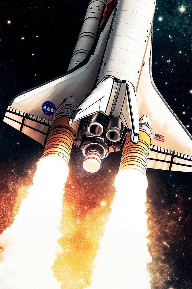 In the dark, mysterious universe, a space glider rises with radiant flames beating out of its engines like mighty sunbeams. The infinite stars twinkle in the background as the majestic vehicle shoots dynamically upwards, driven by the power of progress and discovery. Adventure awaits not far from Earth!