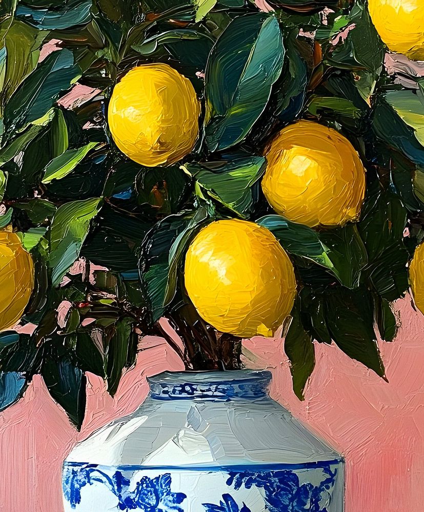 This vibrant still life with lemons and a beautifully painted vase brings a fresh and cheerful atmosphere to any room.