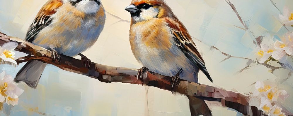Sparrows Spring Blossom - This painting captures an idyllic moment with two sparrows on a branch, enveloped by soft spring blossoms. The use of subtle watercolour-like blues contrasts beautifully with the warm browns and tans of the birds and branch, while the white of the flowers brings a fresh touch to this natural composition.