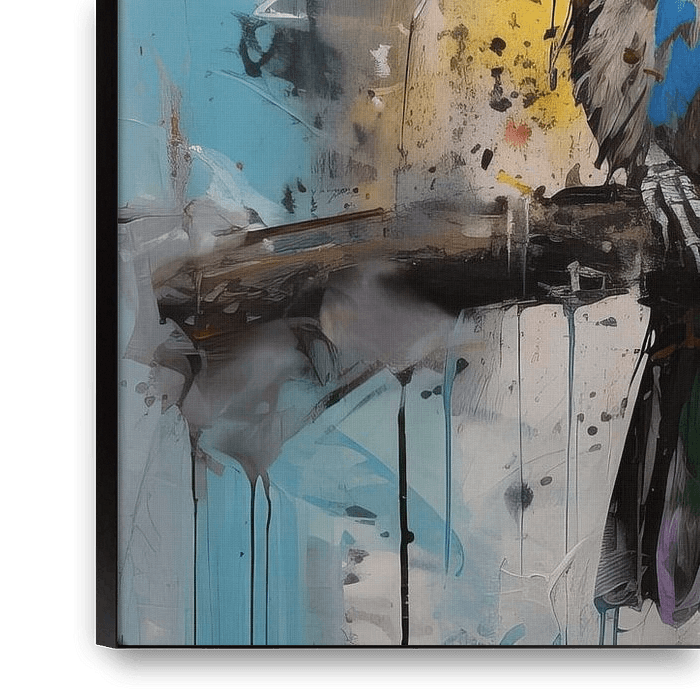 Sparrows - This vibrant piece depicts two sparrows in a distinctly graphic style, sitting on a branch against a background of dynamic splashes of colour. The harmony of neutral brown and grey tones of the birds with bright blue and yellow accents creates a fresh, contemporary feel, while the detailed paint drawing with expressive…