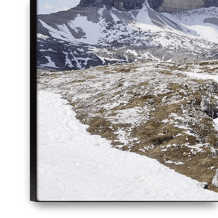 Buy this landscape artwork Spectacular mountain photo of the famous Three Peaks in the Dolomites - a timeless motif for all mountain lovers. Clear structures, impressive rock faces and the unmistakable alpine backdrop by Miriam Schwarzfischer Fotografie on canvas, ArtFrame, poster and wallpaper, printed on demand in high quality.