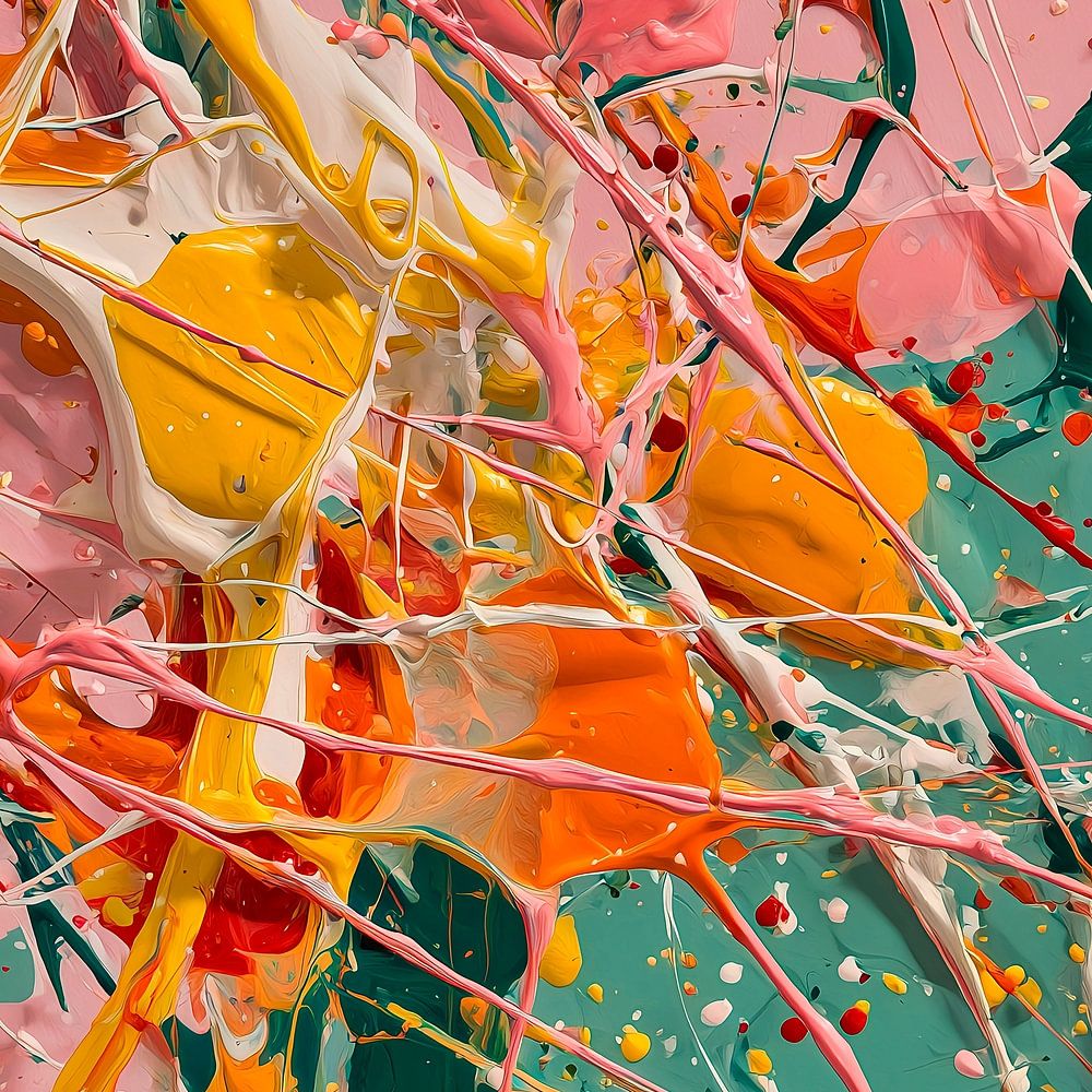An abstract artwork with a dynamic paint splash on a textured background. The base colour is a soft pastel pink which evokes a playful and vibrant atmosphere. Over this, energetic splashes of different colours give a sense of movement and spontaneity. Fine, thin white paint lines add depth and complexity. The overall atmosphere is…