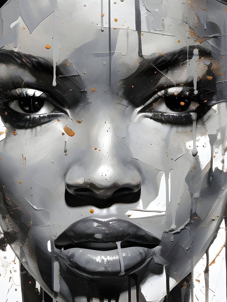 Splattered Sophistication shows a powerful portrait rising from a sea of grey tones, where the strength of black and white is punctuated by bursts of golden speckles. The subject's intense and compelling eyes act as windows to a soul demanding attention amid the fluid chaos of dripping paint, evoking a sense of power and mystery.