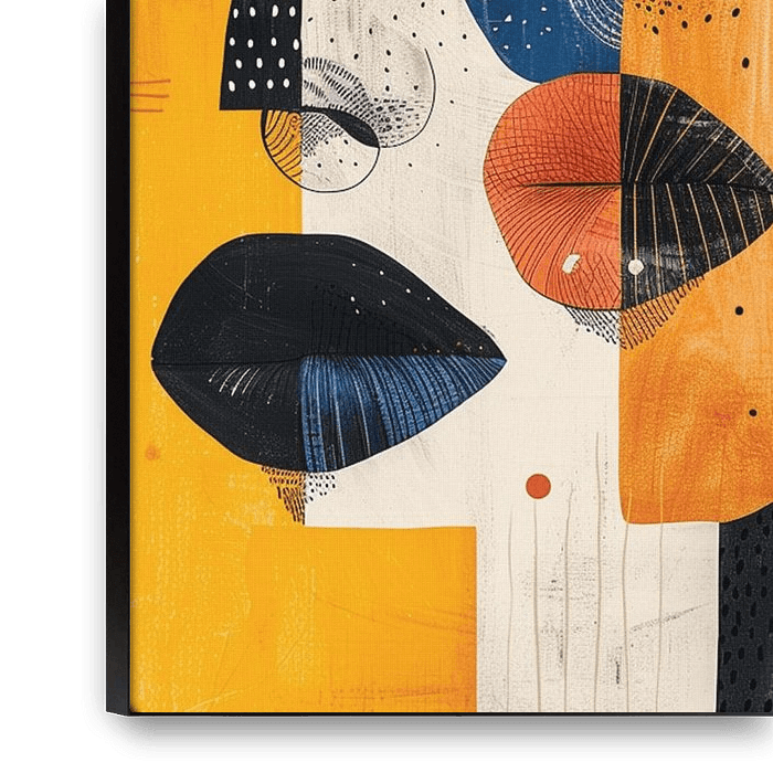 This artwork presents an abstract double-face portrait built from bold geometric shapes, layered textures, and expressive linework. The composition combines deep blue, warm orange, black, and cream tones to create a striking contrast between two stylized faces that appear merged into one visual statement. I wanted the piece to feel…