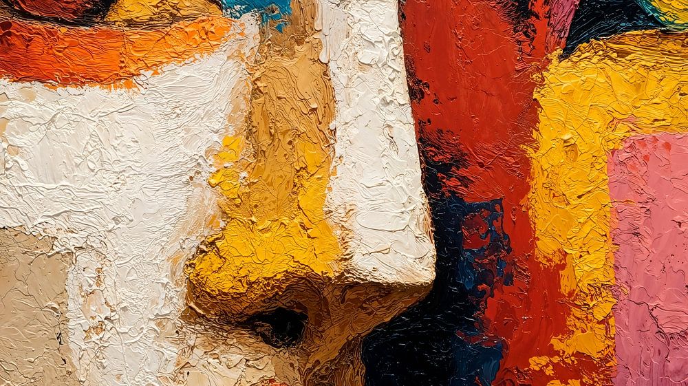 An abstract portrait in panoramic style depicting a face divided into two halves, painted with thick impasto paint, which emphasises the portrait’s abstract, artistic style. The overall atmosphere is powerful, expressive and modern.