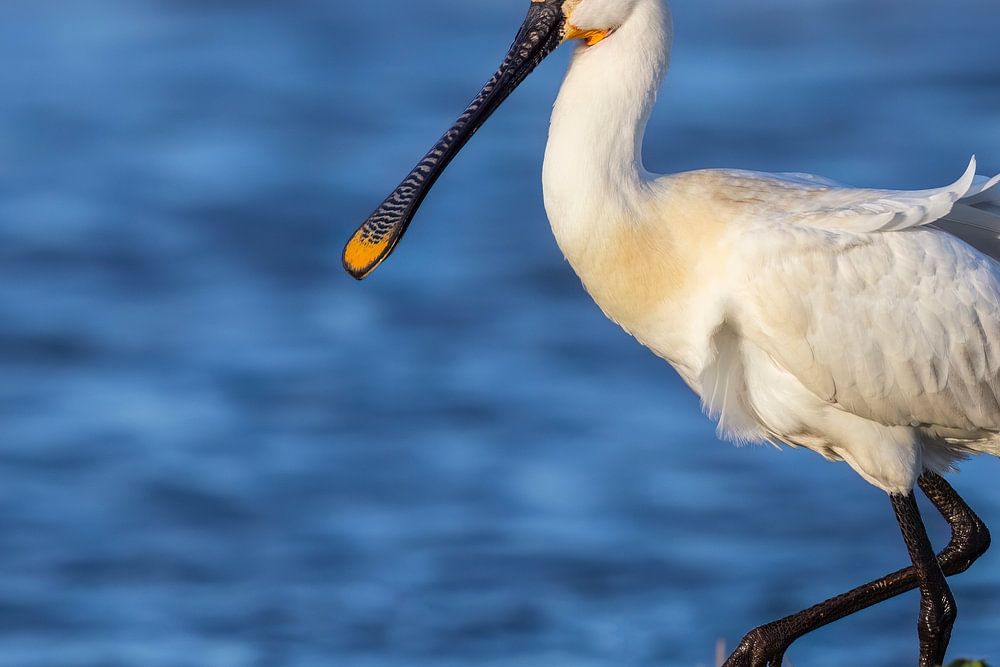 A spoonbill foraging on Texel. The sun makes its plumage shine and the blue sky is reflected in the water.