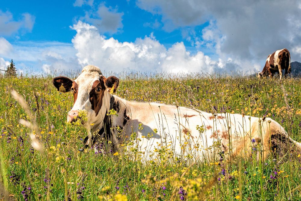 Buy this flower art Spotted cow in a meadow full of flowers in the Italian dolomites by Wout Kok on canvas, ArtFrame, poster and wallpaper, printed on demand in high quality.