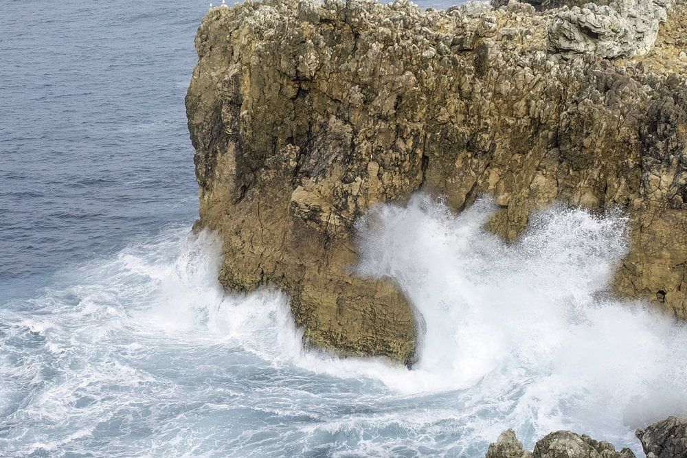 The surf hits the cliffs near Sagres in Portugal. The force of the waves and wind is palpable. In the foreground, the surf hits the cliffs and creates a spray that rises metres high. Subsequent waves increase the pressure and cause ever new eruptions. In the background you can see the coastline continuing on the horizon.