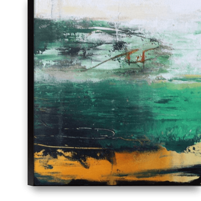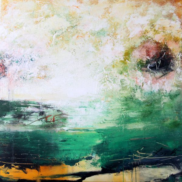 Spring Awakening This abstract painting is reminiscent of a vast, atmospheric landscape in spring. Light, cloud-like structures open up the upper part of the picture, while below, fresh green and warm earth tones evoke awakening nature and new vitality. The flowing colours create a sense of movement in the landscape – as if nature…