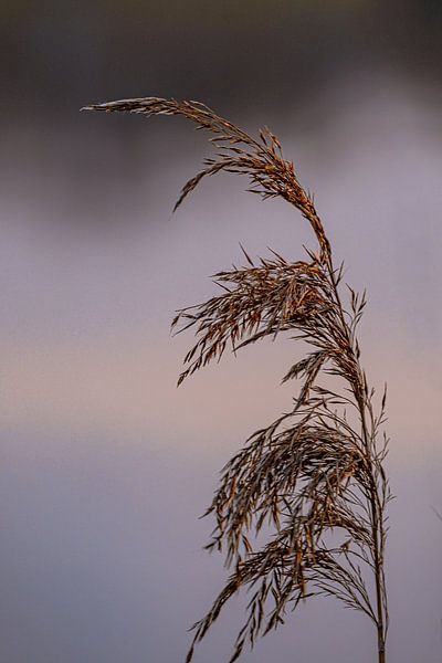 The image shows a close-up shot of a single, elegantly curved reed or grass plant against a diffuse, neutral background.