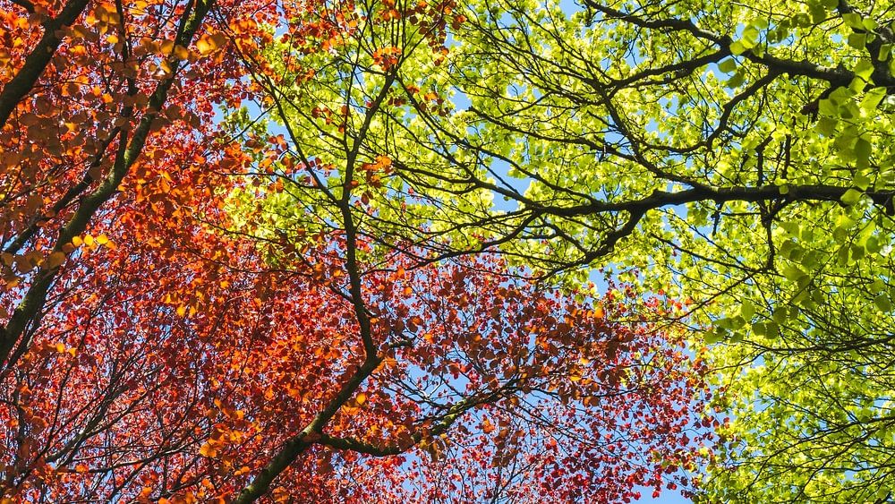 Two beautiful beech trees in spring in the forest near Leersum. One beech has fresh green leaves. The other is a red beech. The leaves look like autumn colours, but are really the new leaves of the new growing season.