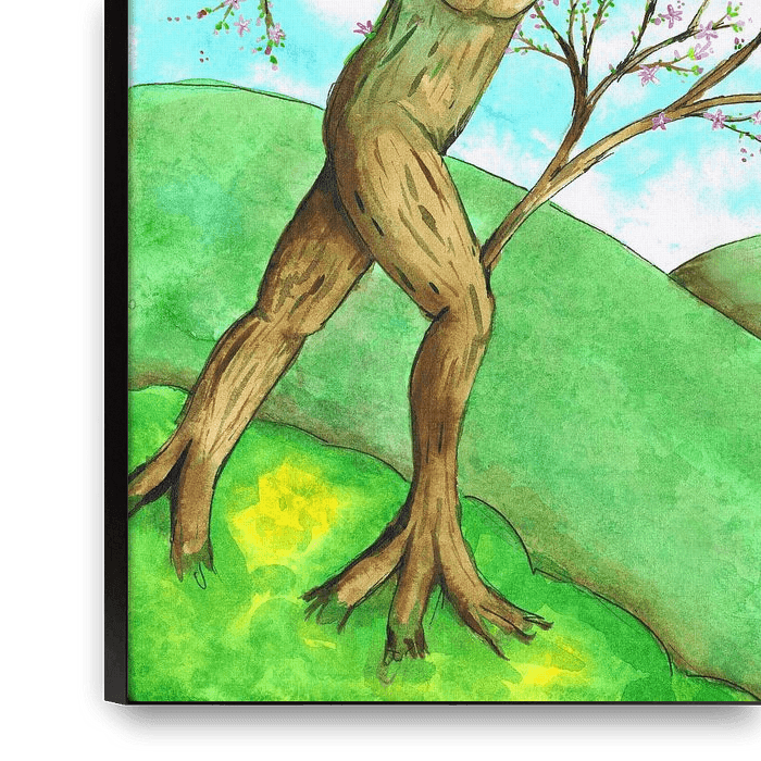A watercolor drawing of a mythical creature, a dryad. A dryad is a tree nymph that looks like a beautiful woman and is connected to the tree.