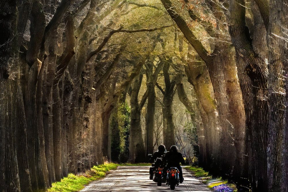 Motorcyclists in early spring in Drenthe on a beautiful road flanked by rows of old trees and blooming crocuses. The sunbeams shine through the trees, creating beautiful light effects and shadows.
