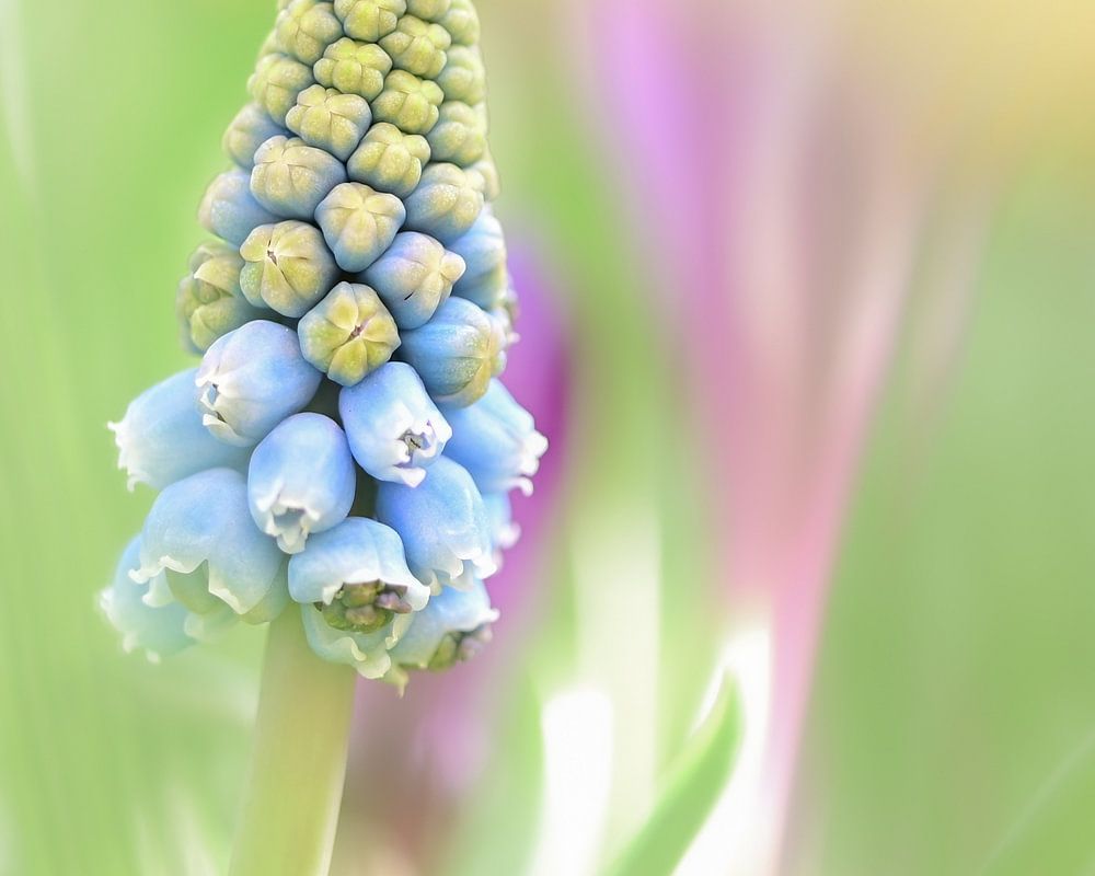 In this dreamy spring photo, a blue grape is in full view, surrounded by a haze of soft colours and light. The background is almost abstract, with hints of purple, yellow and fresh green - like a watercolour on the border of reality and imagination.