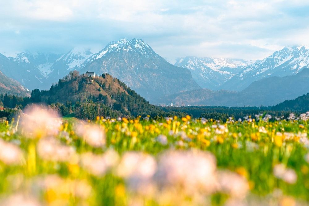 Spring view in Allgäu of Allgäu Alps and castle church St. Michael
