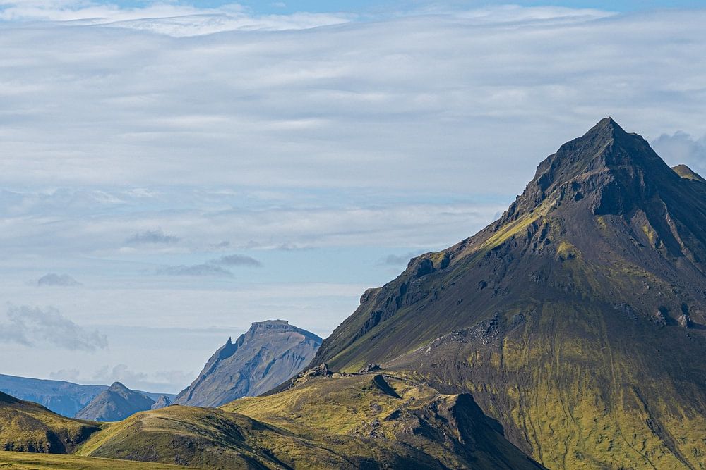 In the shadow of the pointed mountains surrounding Álftavatn, a vibrant Icelandic spring landscape unfolds. The mountains, shrouded in rich green splendour, tower high above the clear horizon. Their shapes, sharp and impressive, reflect the sheer beauty of nature in its most pristine state.