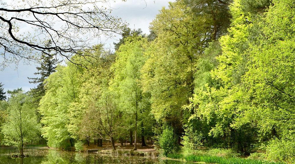 A beautiful panorama of a forest edge with beech and fir trees. The sunlight on the fresh beech leaves really make it a spring image. A path runs around a pond and on the left is a tree that is still bare, making the other side come into view nicely.