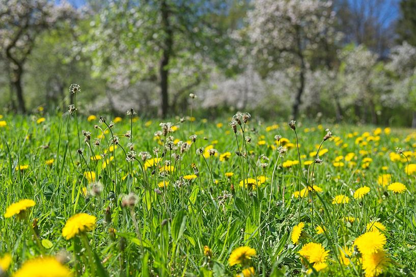 Spring is the most beautiful time of year for me. After the often grey winter days, nature blossoms and shows its energy in green and magnificent colours. This picture was taken in a meadow orchard near Erfurt in Thuringia. Dandelions in particular are turning the meadow yellow. Fruit trees and bushes bloom in the background.