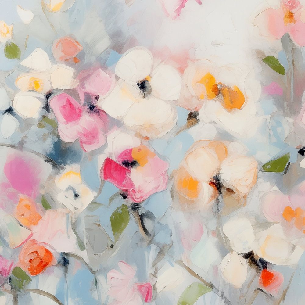 Abstract painting in soft pastel tones with cheerful little spring flowers.