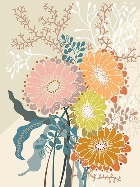 Buy this flower art Springtime Daisies Earthy Tones by Annick on canvas, ArtFrame, poster and wallpaper, printed on demand in high quality.