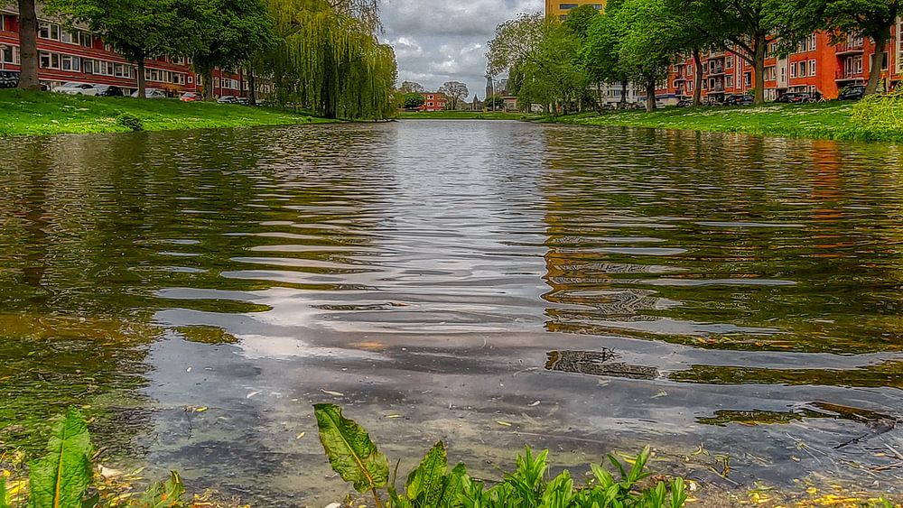 Always a wonderful sight. Photo taken in the direction of the Wielewaalplein. low at the water's edge.
