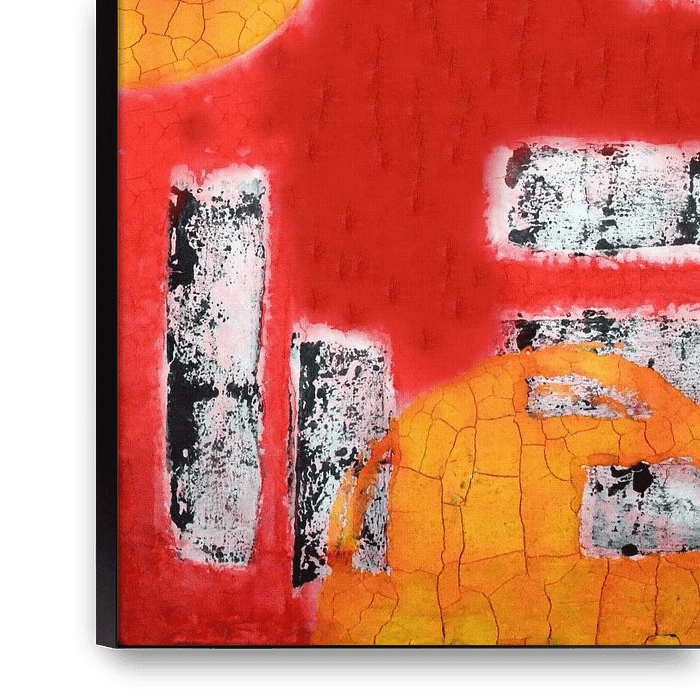 Several black and white interspersed squares are spread over a red textured ground and enter into interesting correlations with yellow semicircles criss-crossed with cracks.