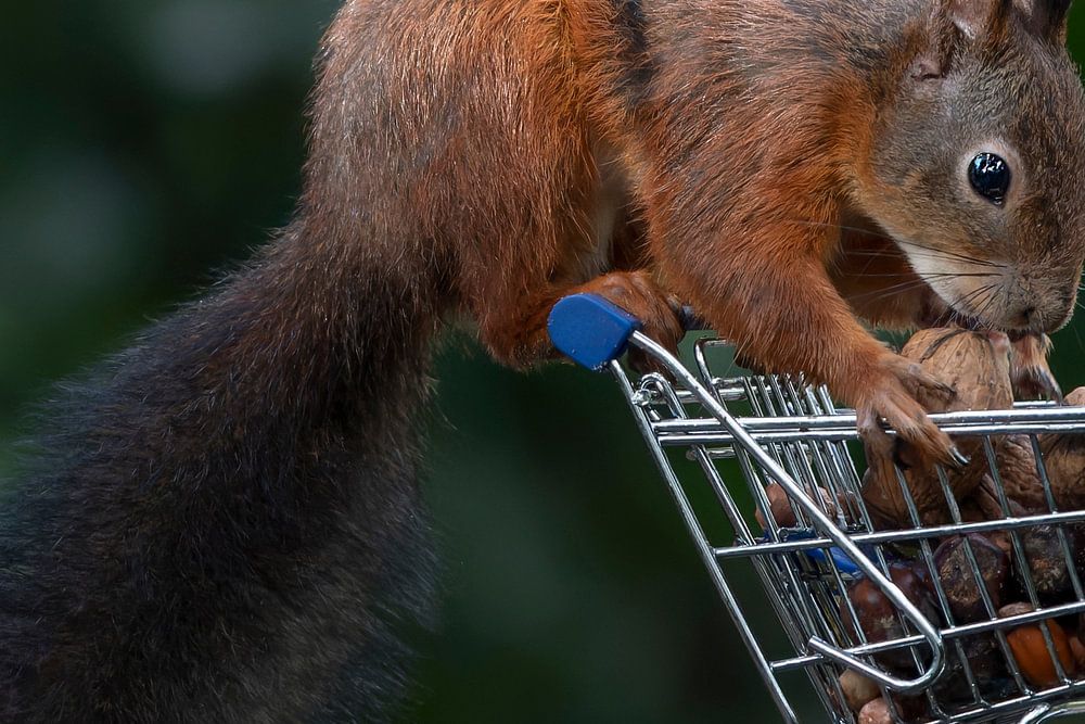 Squirrel with shopping cart full of nuts. by Albert Beukhof