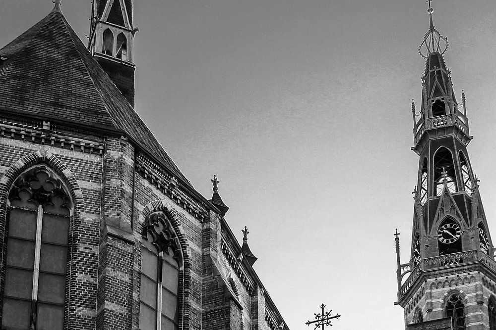 A black-and-white shot of the Sint Jozefkerk in Groningen, captured from a powerful perspective that emphasises the height and details of the facade. The imposing towers and rich brickwork are highlighted even more by the choice of black-and-white photography. Without colour, the focus is entirely on the lines, structures and contrasts of this impressive structure.