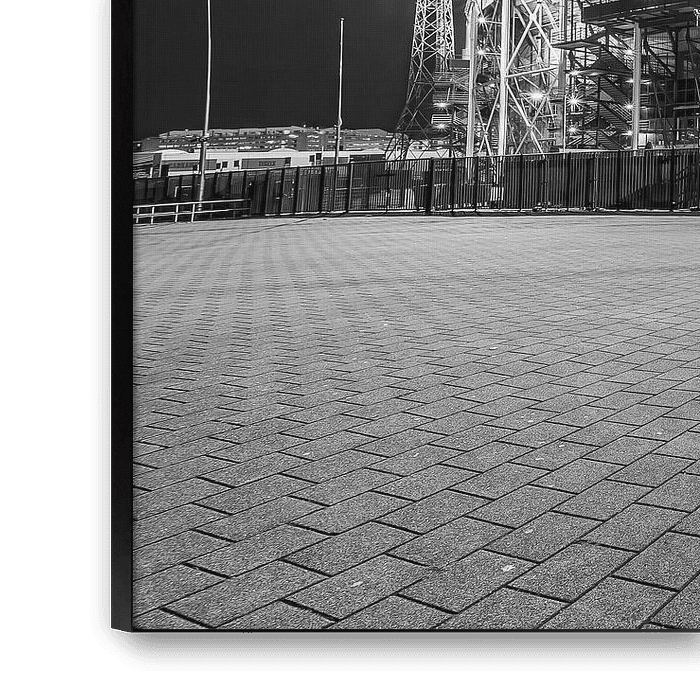 This photo of stadium de Kuip was taken near the stadium on an evening in October 2017. De Kuip is the home ground of the Rotterdam football club from the Feijenoord district. The stadium pylons were illuminated on this evening, making it extra beautiful to photograph. The photo is also available as a colour version.