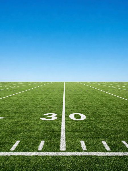 This clean and refreshing sports design features a wide-open football field stretching toward the horizon, with a bold yard line marking the center. It creates a sense of space, focus, and anticipation—like the quiet moment before kickoff when strategy meets adrenaline. The bright sky and perfectly lined turf evoke the atmosphere of a…