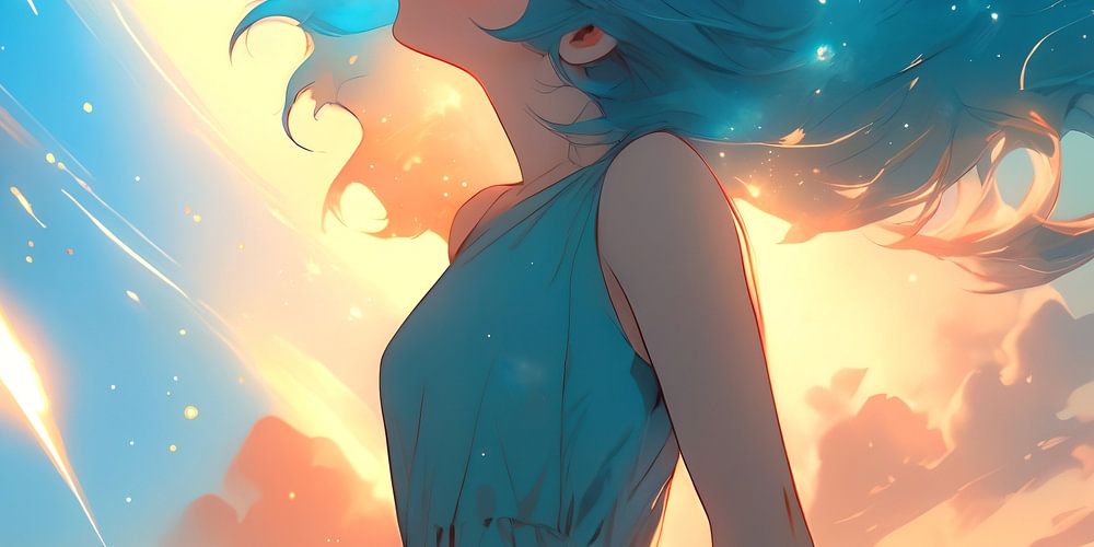 A girl with long blue hair and a blue summer dress looks up dreamily.