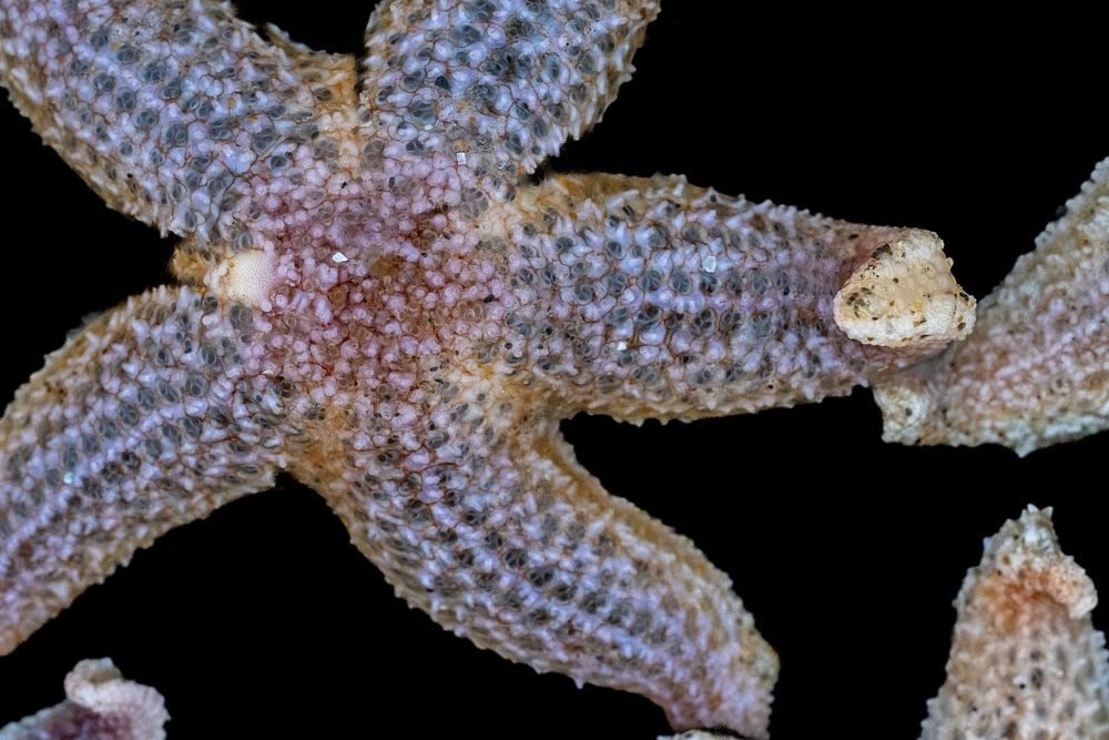 A starfish lies peacefully on the edge between sea and land, captured in a moment of stillness. The delicate texture and subtle colours lend the image an almost abstract quality, where nature and form come together in a minimalist composition.
