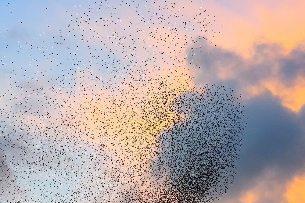 Starling murmuration during sunset at the end of the day by Sjoerd van der Wal Photography