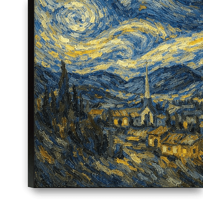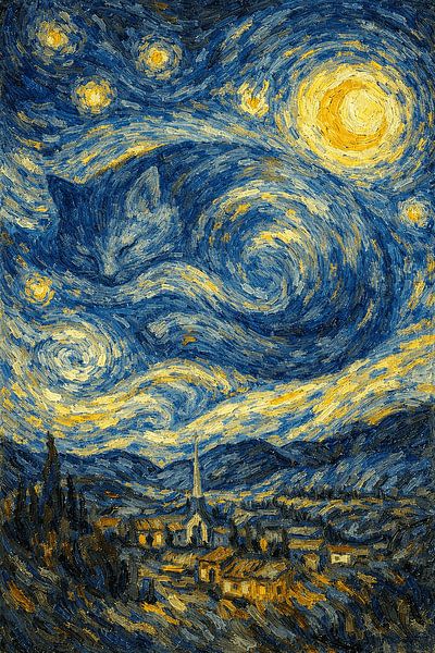 This artwork presents a poetic fusion of two beloved worlds: iconic post-impressionist night skies and the quiet charm of cats. Inspired by swirling nocturnal landscapes, the composition reimagines a luminous night sky filled with deep blues and glowing golden stars, subtly forming the silhouette of a giant sleeping cat above a peaceful…