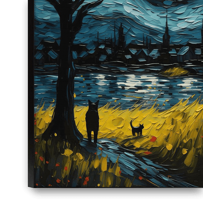 Buy this digital art artwork Starry night with cat by NJ Midnight Studio as a reproduction on canvas, ArtFrame, poster and wallpaper, printed on demand in high quality.