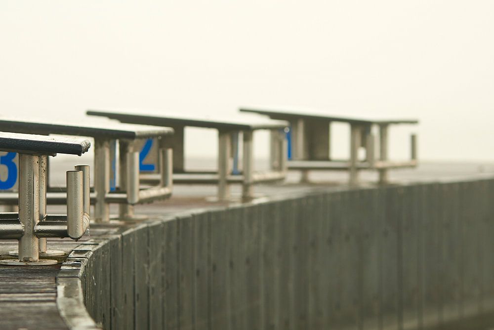 Starting blocks in the fog on a swimming jetty in the Wolderwijd near Zeewolde in Flevoland. It is constructed in the Wolderwijd near the beach to be able to swim in the water with a considerable depth of about 3 meters.